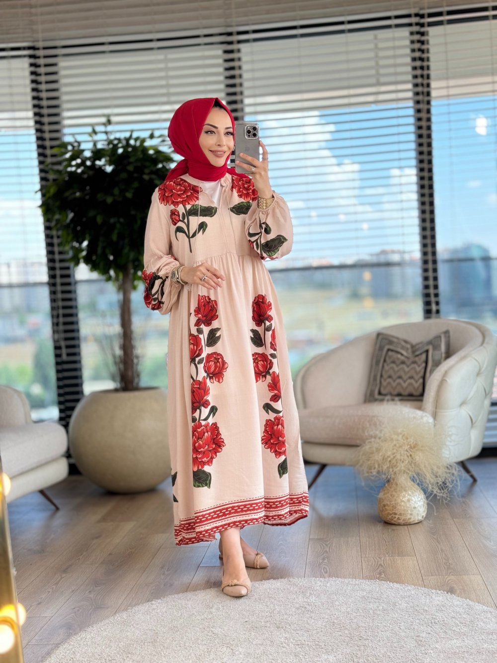 24EL056 Yakası Püsküllü Gül Desenli Elbise Bej