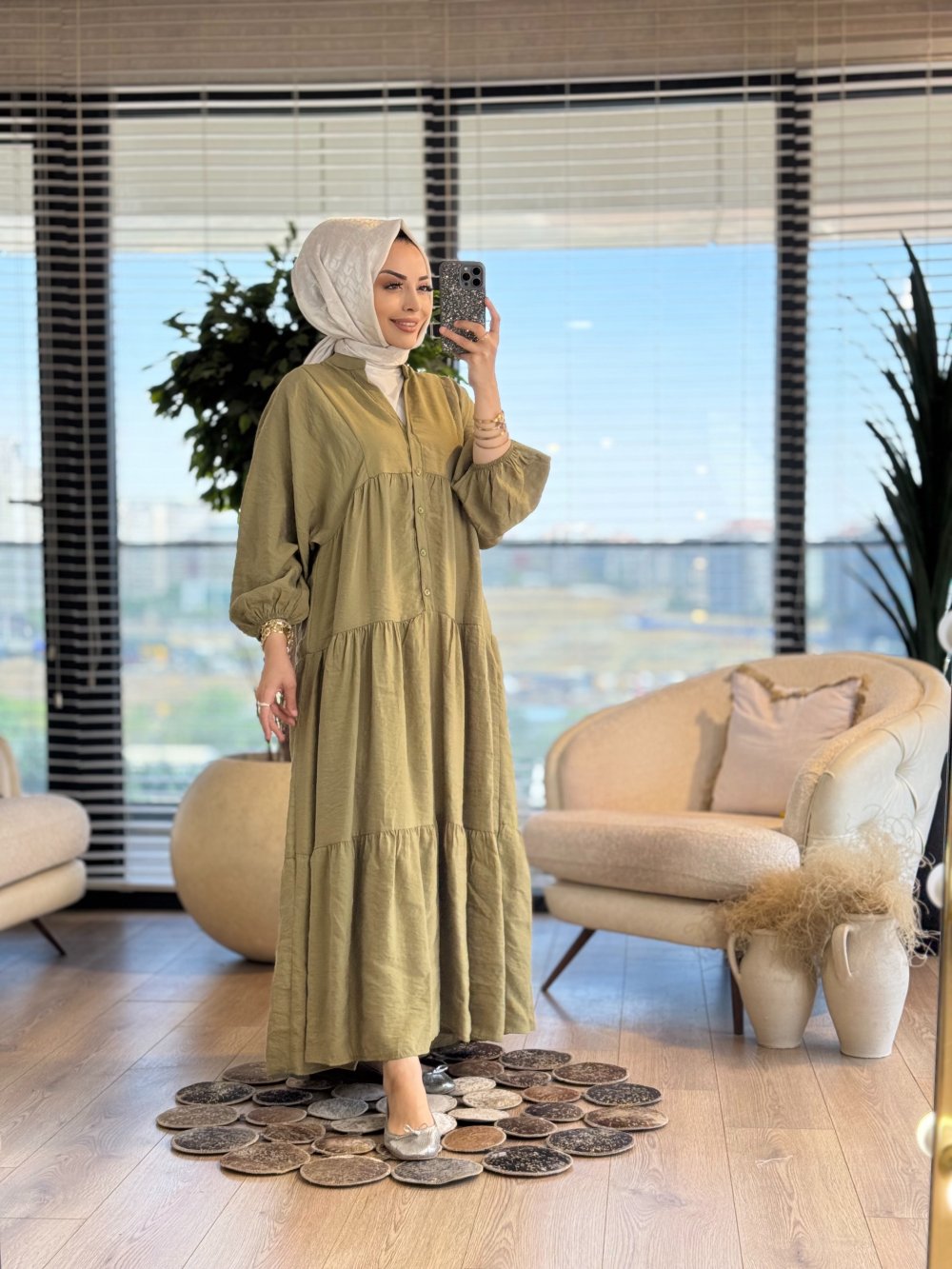 24EL147 V Yaka Patı Düğmeli Düz Elbise Haki