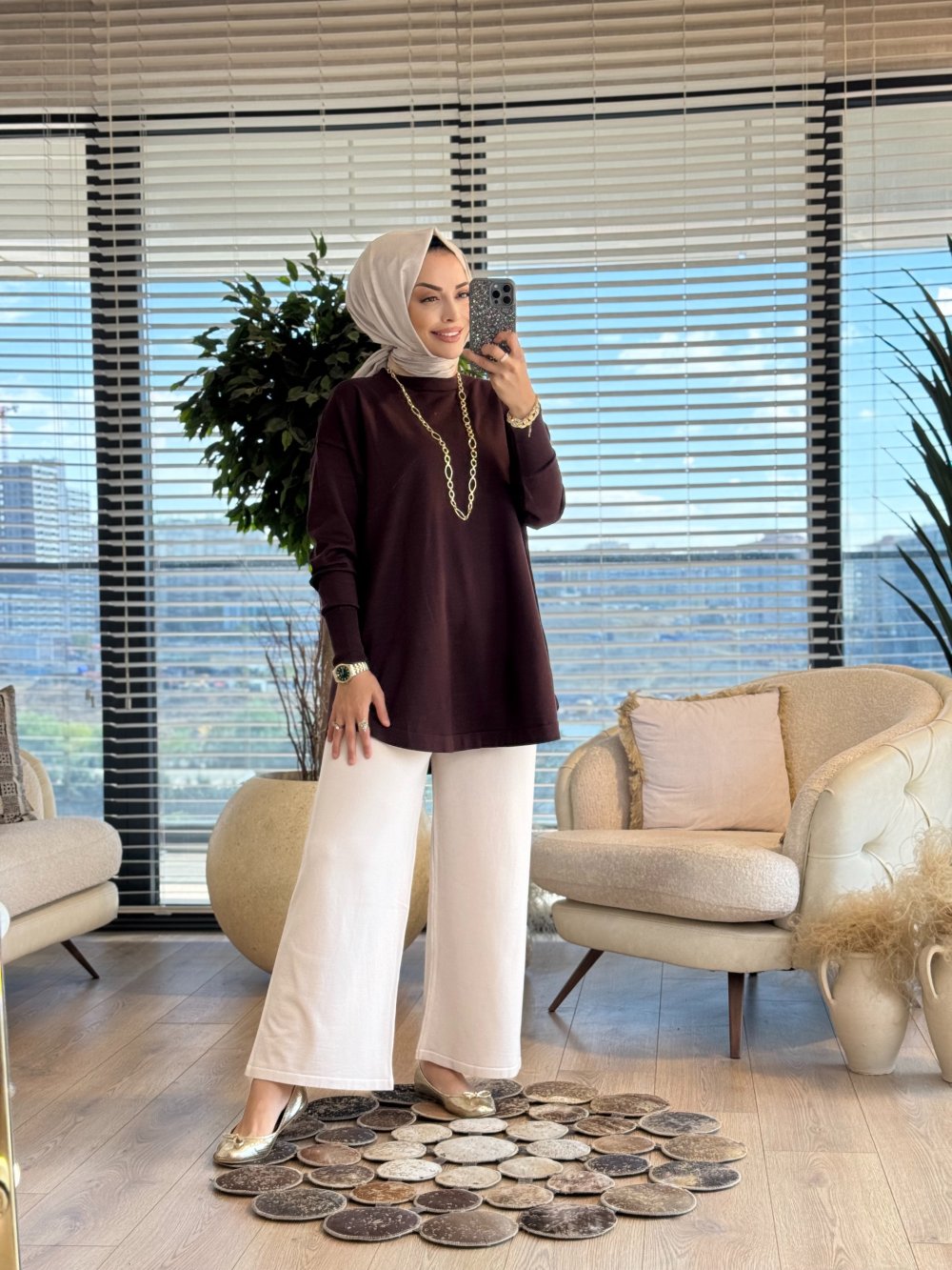 25004 Eteği Oval Sıfır Yaka Triko Tunik Kahve