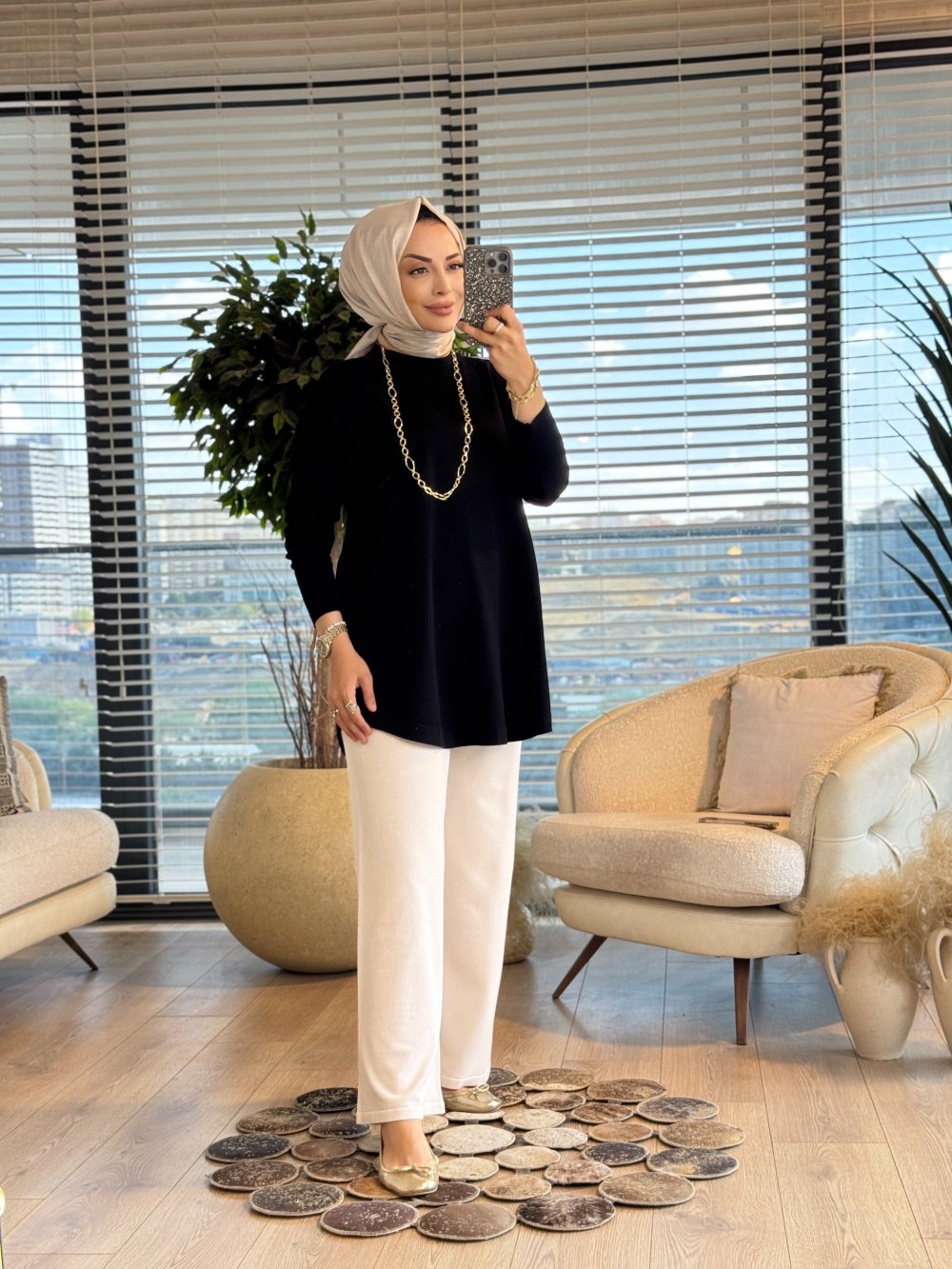 25004 Eteği Oval Sıfır Yaka Triko Tunik Siyah