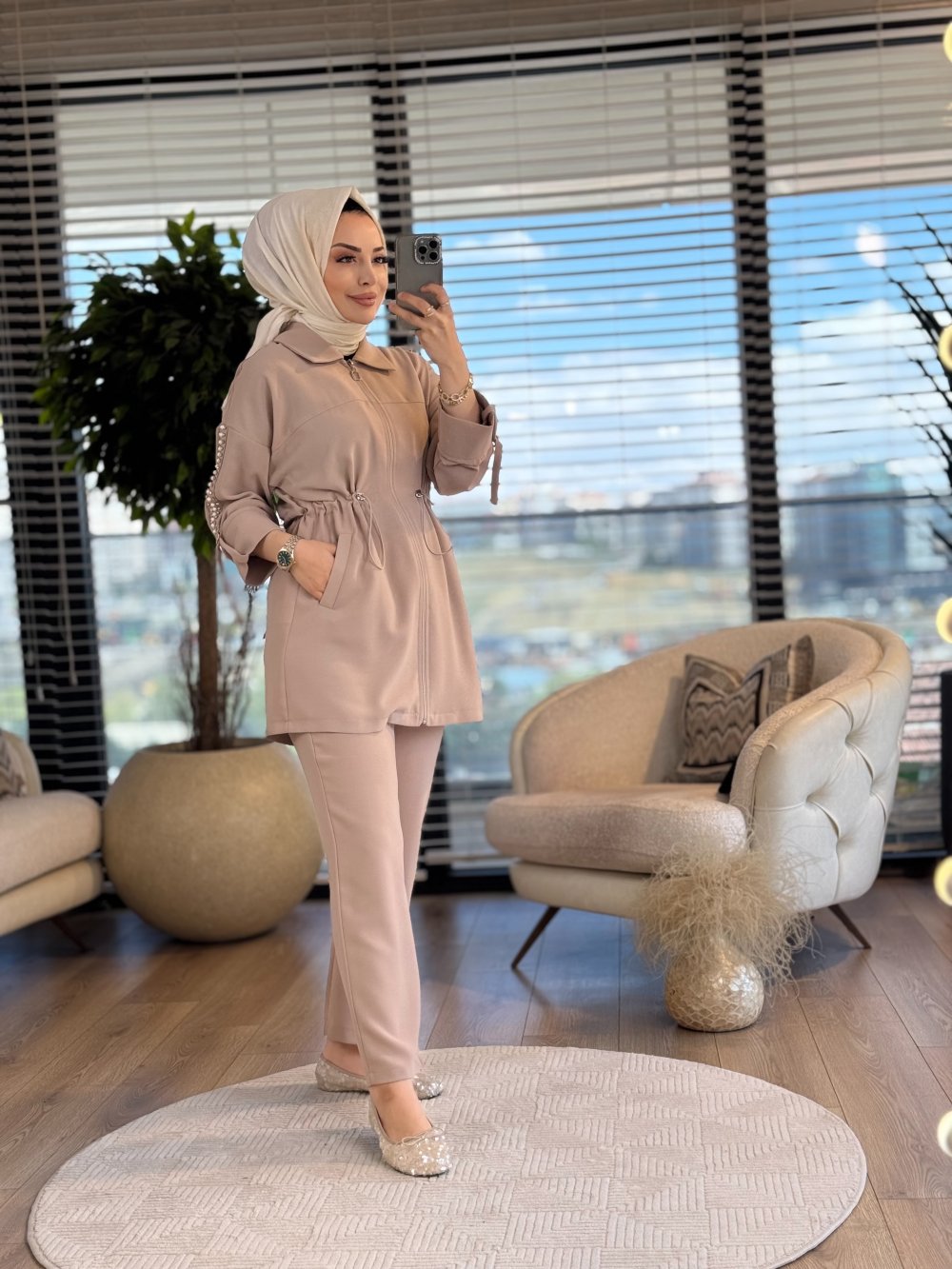 25015 Kolu İncili Fermuarlı Takım Siyah
