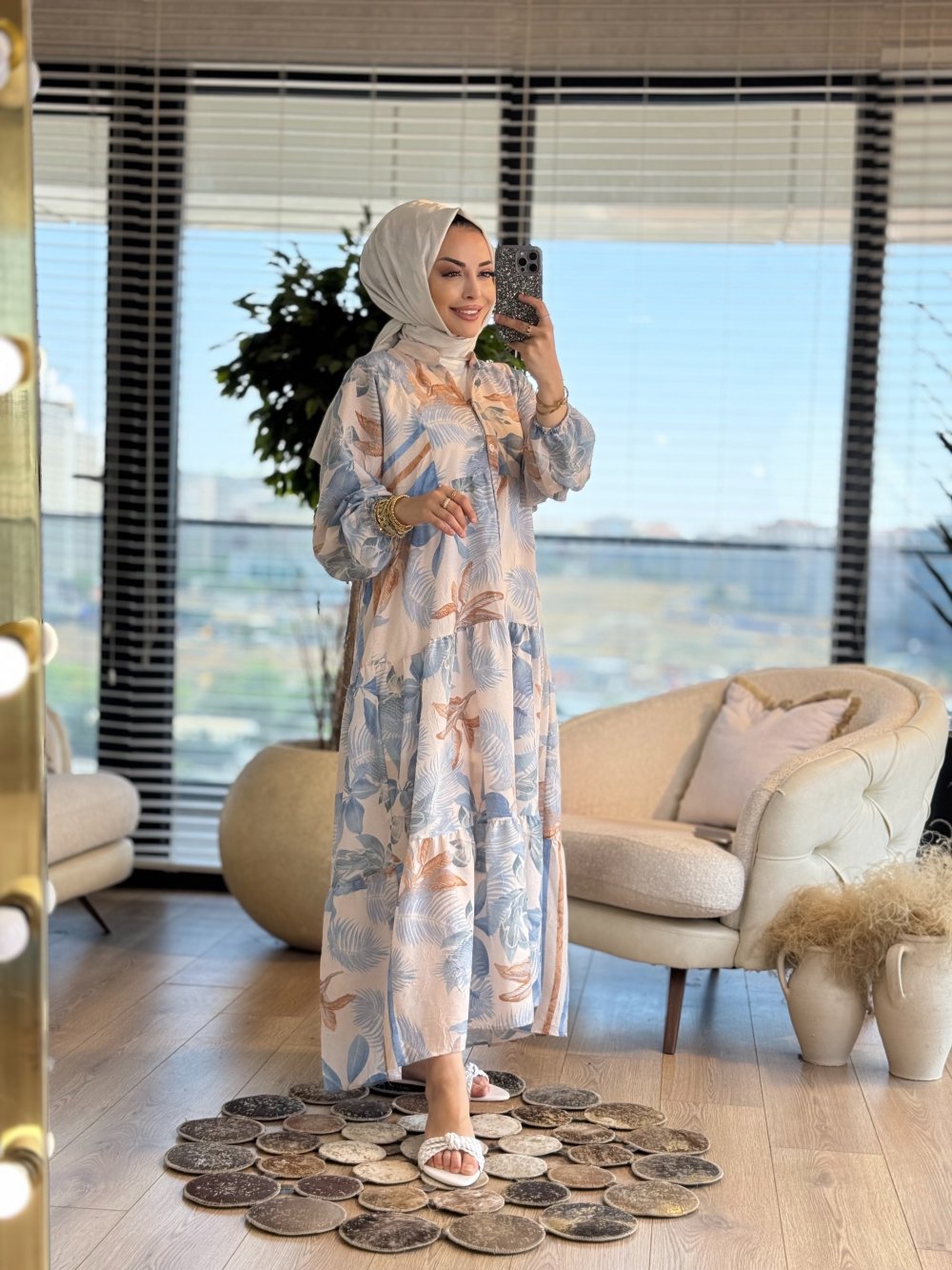 2512-1 Desenli V Yaka Patı Dügmeli Elbise Mavi