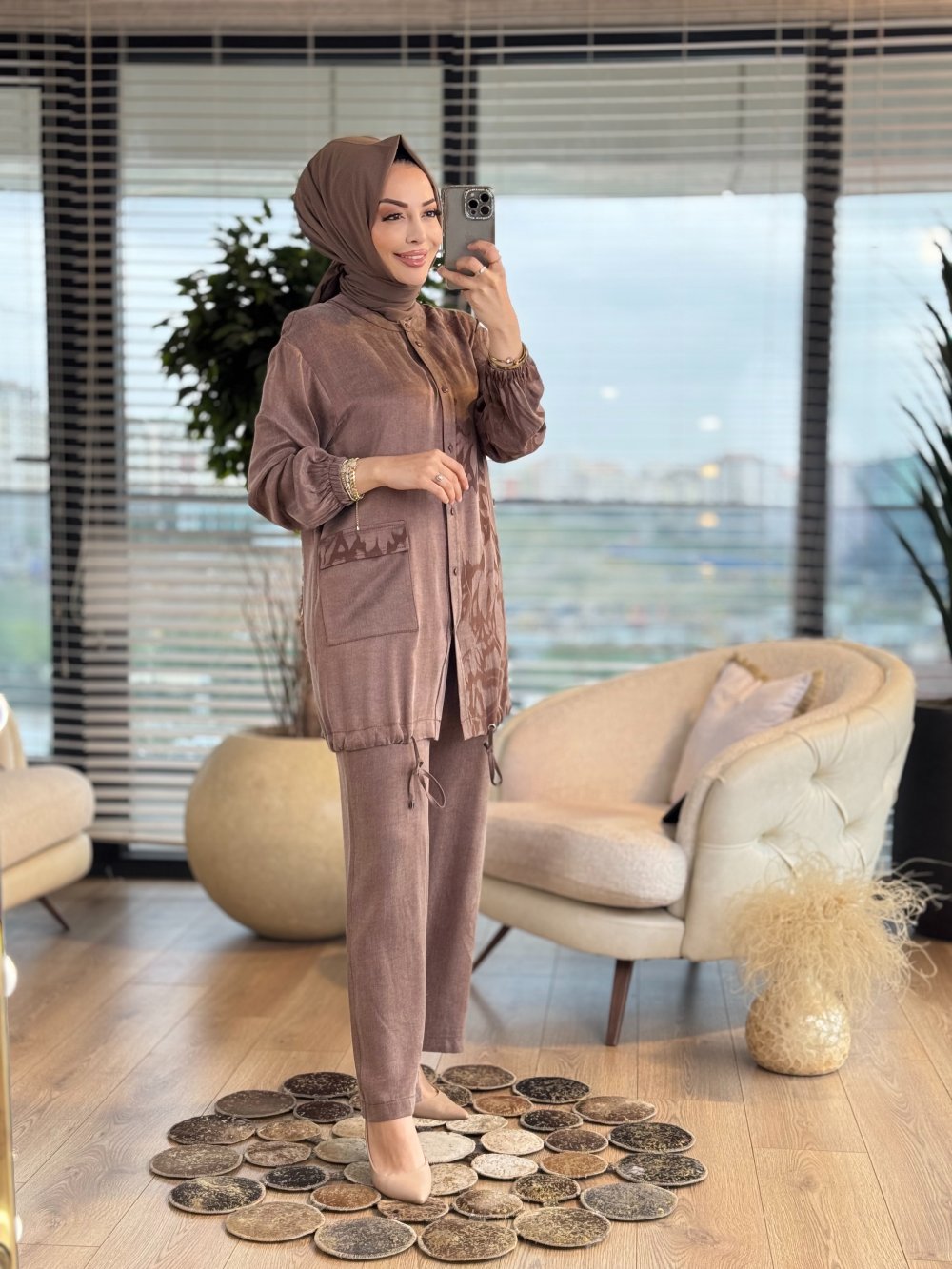 2543 Sağ Taraf Kendinden Desenli Düğmeli Takım Kahve
