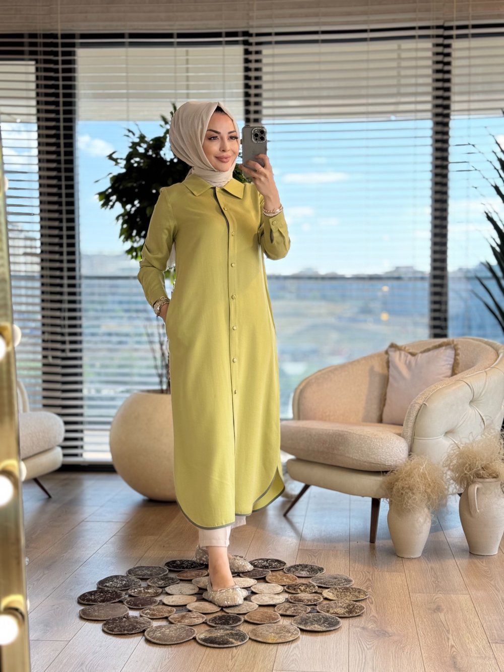 2546 Kombinli Tencel Şanel Pardesü Yağ Yeşili