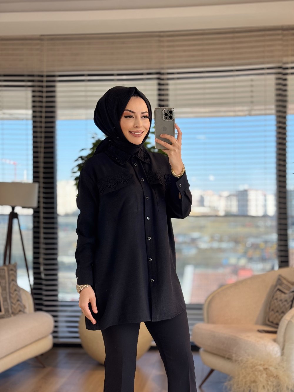2553 Yakası Ve Cepleri Dantel Detaylı Gömlek Siyah