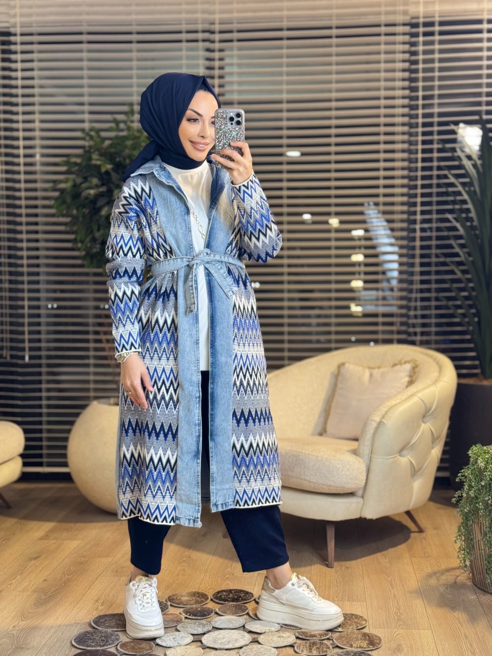 25560 Renkli Uzun Kot Triko Hırka Mavi Saks