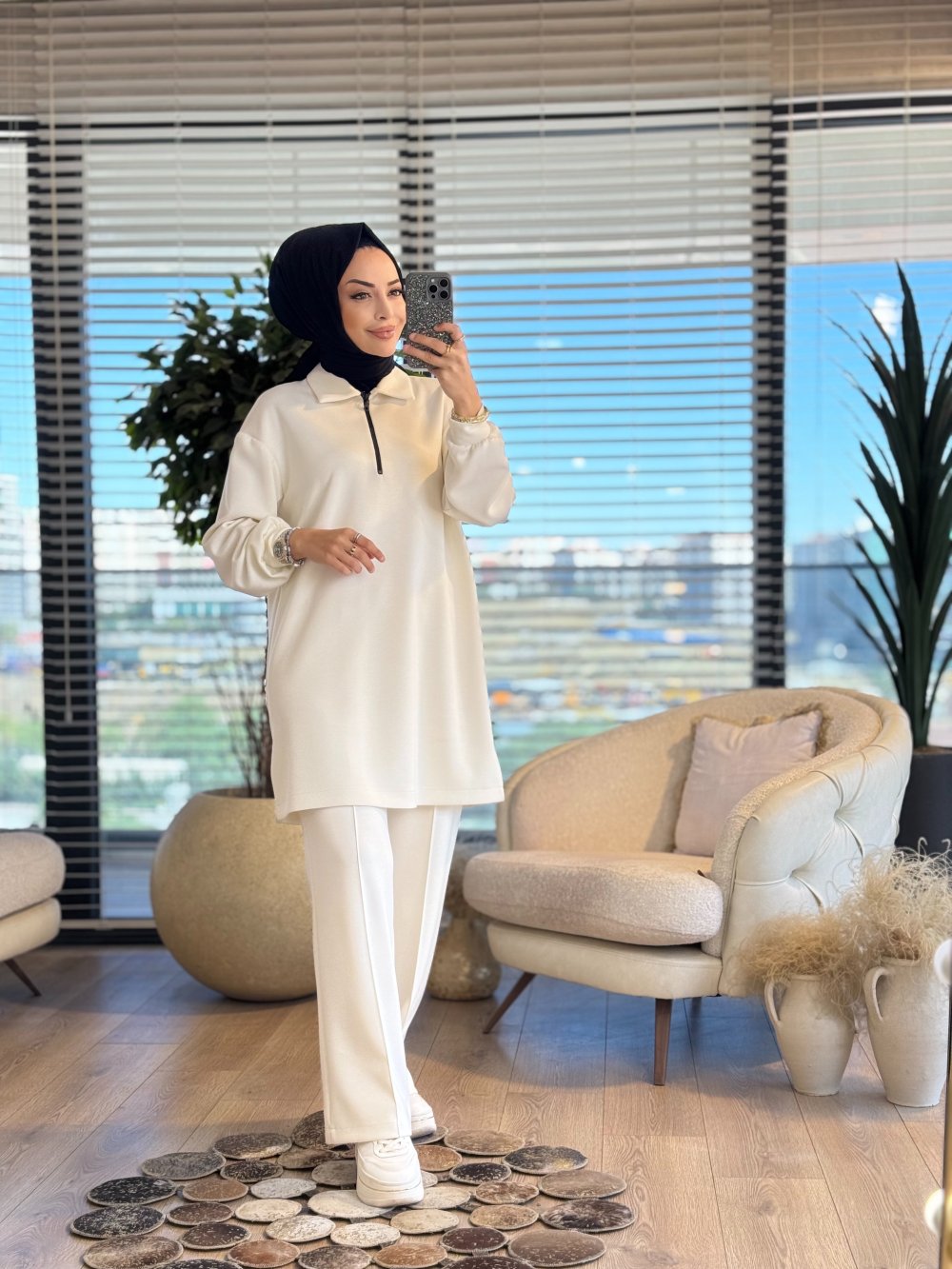 2564 Patı Fermuarlı Polo Yaka Takım Ekru