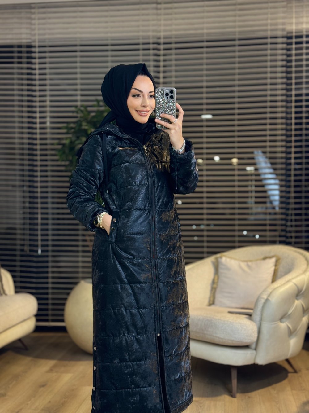 2565 Batik Kapitone Kapşonlu Uzun Kaban Siyah