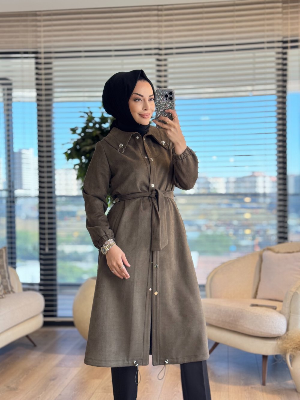 2569 Yakası Lastikli Süet Pardesü Haki