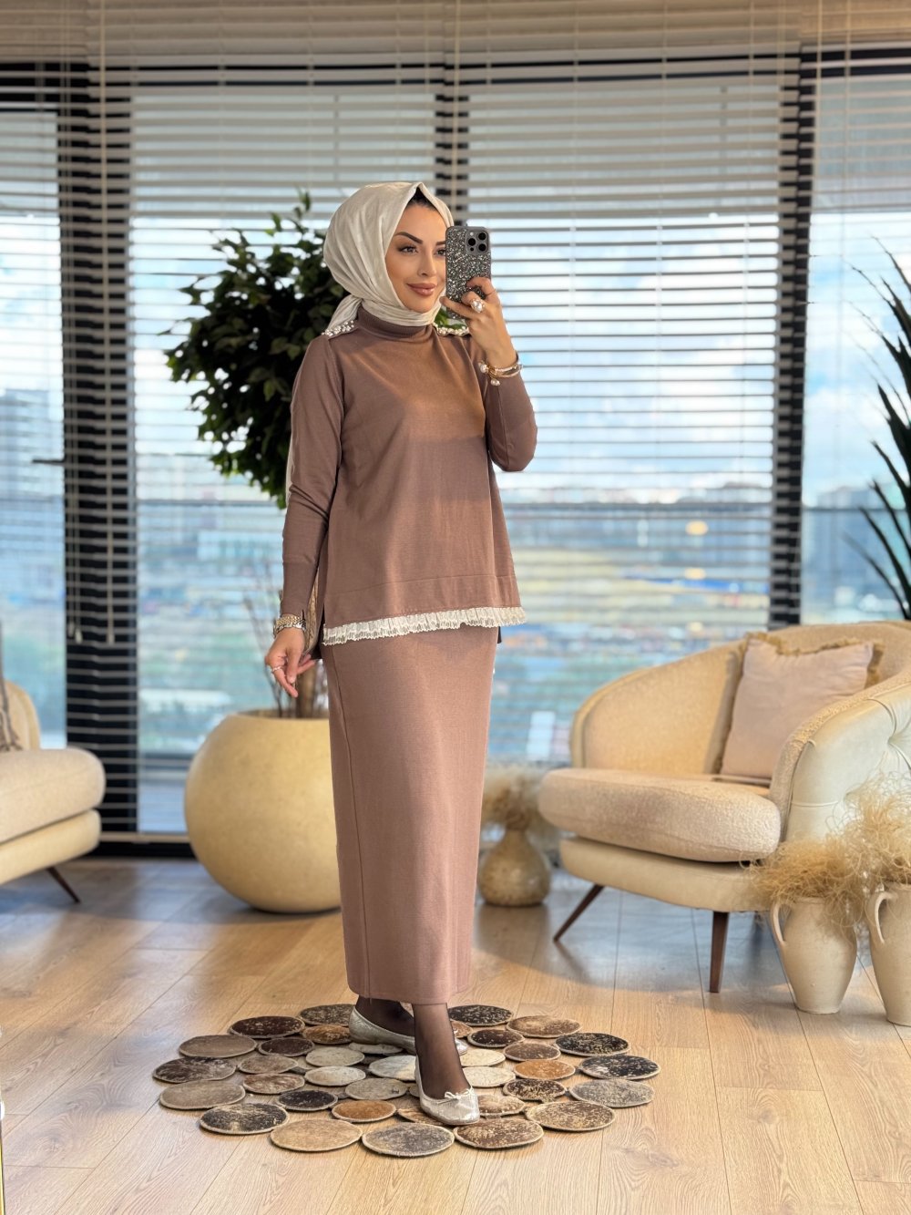 257 Omuzu İncili Dantelli Triko Etekli Takım Vizon