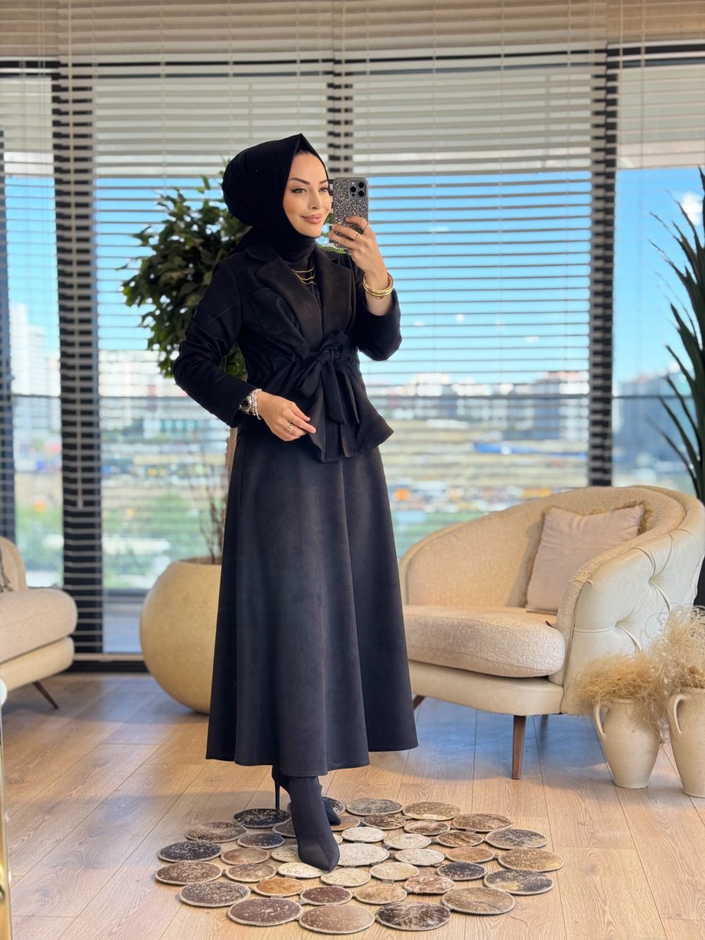 2573 Süet Beli Kuşaklı Etekli Takım Siyah
