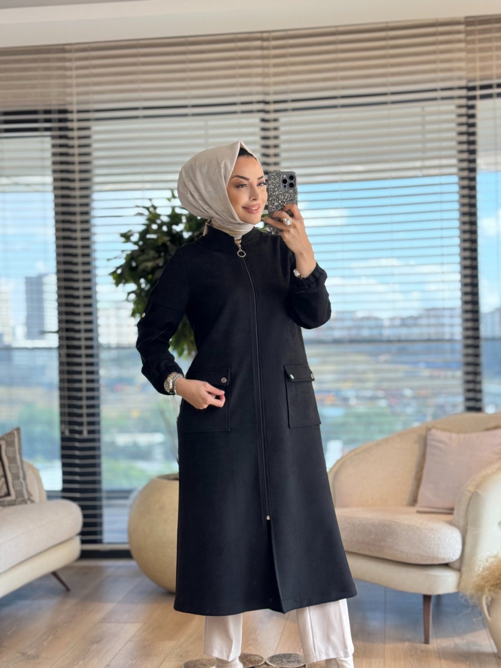 2575 Süet Önden Cepli Fermuarlı Kap Siyah