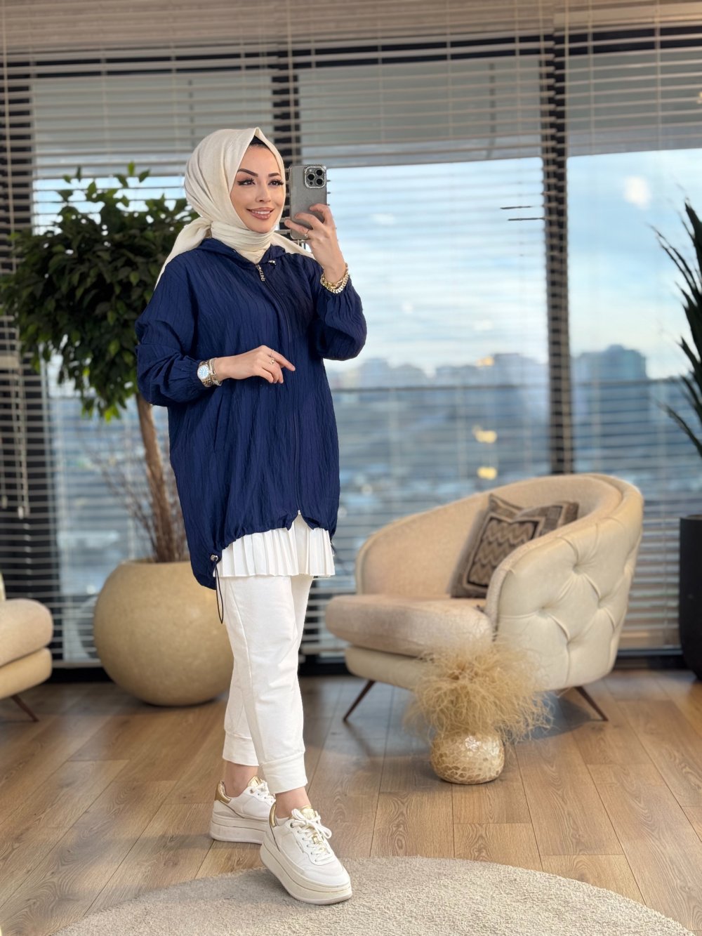 2585 Kendinden Çizgili Kapşonlu Hırka Lacivert