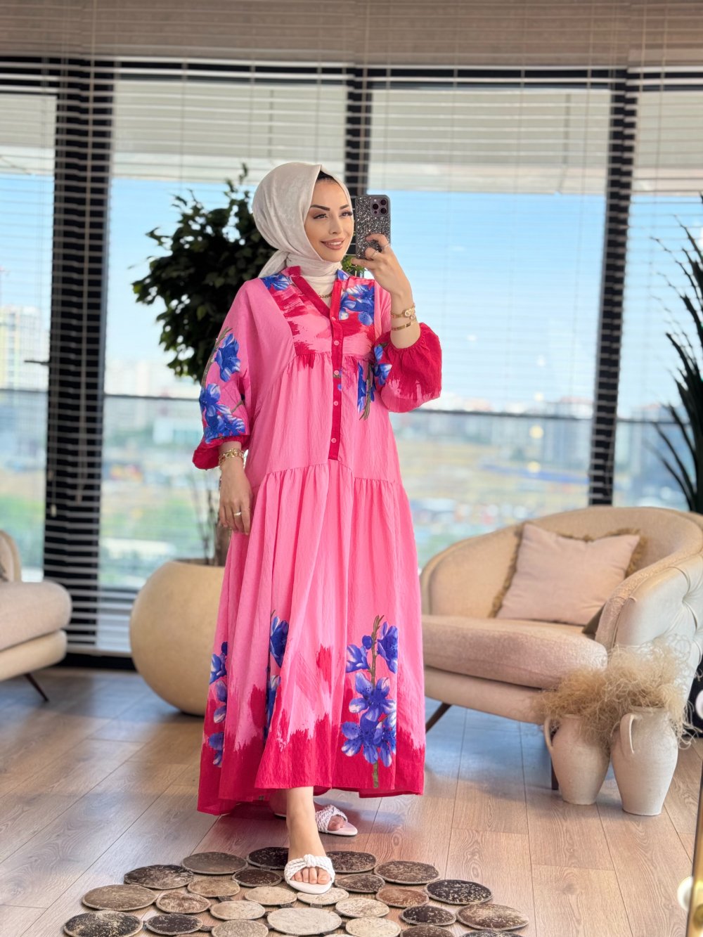 25EL426 Büyük Menekşe Desen Elbise Fuşya