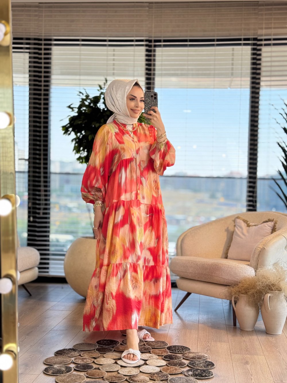 25EL459-2 Desenli V Yaka Düğmeli Elbise Mercan