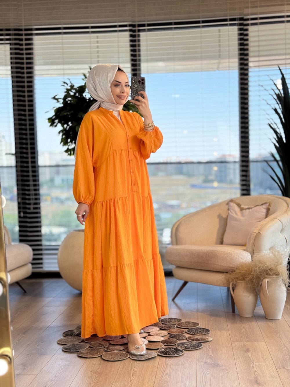 25EL463 V Yaka Düğmeli Düz Elbise Oranj