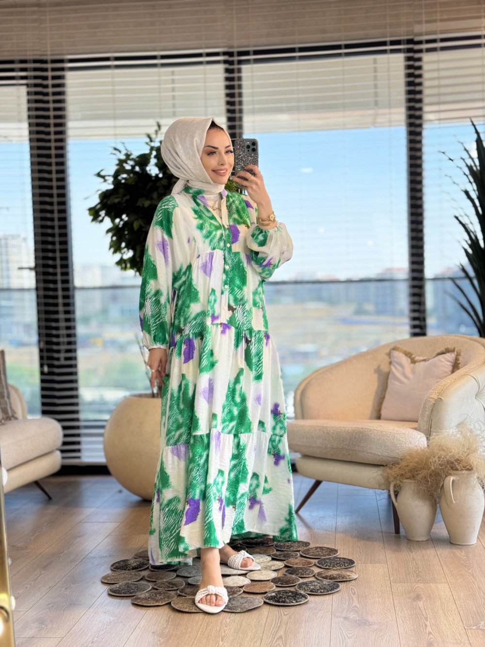 25EL514 Batik Yaprak Desenli V Yaka Elbise Mor Benetton