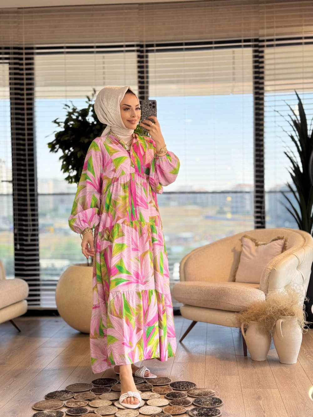 25EL568 Renkli Tüy Desenli Elbise Fuşya