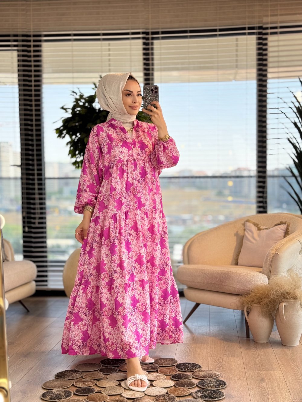 25EL570 Kasımpatı Çiçekli Elbise Fuşya