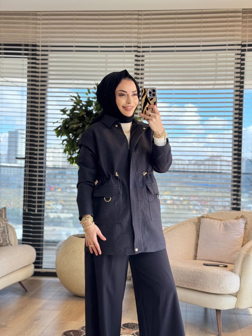 25KT525 Kendinden Desenli Fermuarlı Ceket Siyah