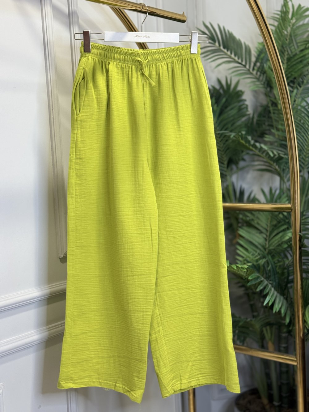 26087 Keten Bol Paça Pantolon Yağ Yeşili