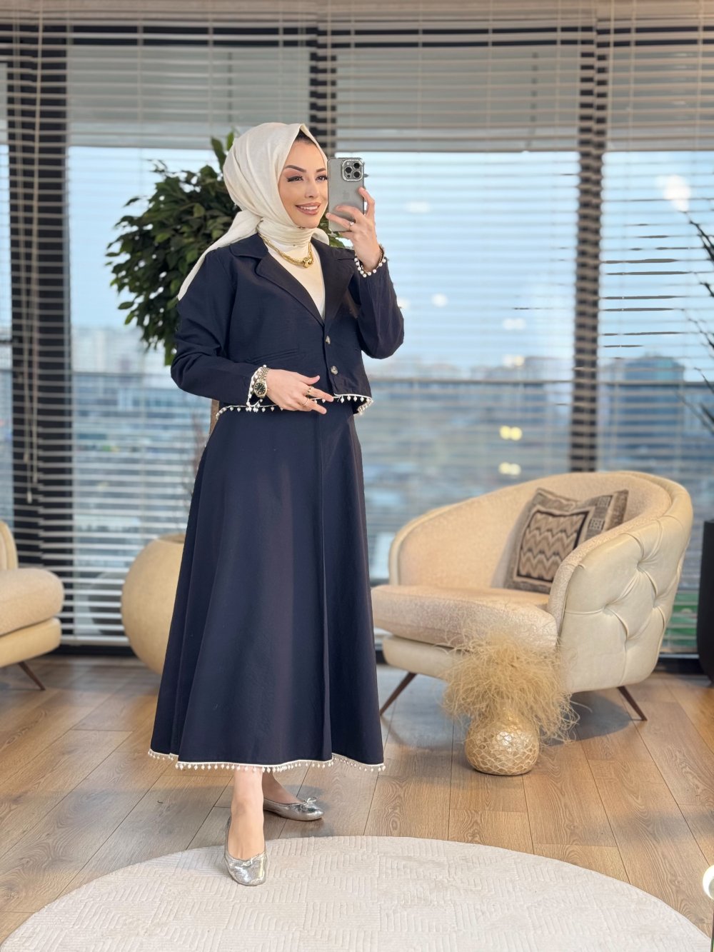 2626 Şerit İnci Detaylı Etek Takım Siyah