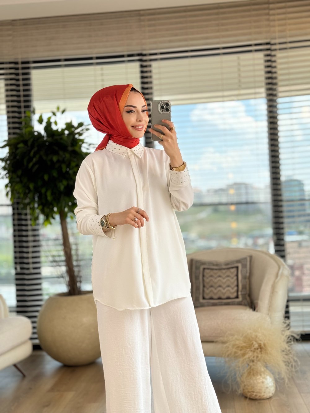 2630 Manşeti Ve Yakası Taşlı Gömlek Ekru