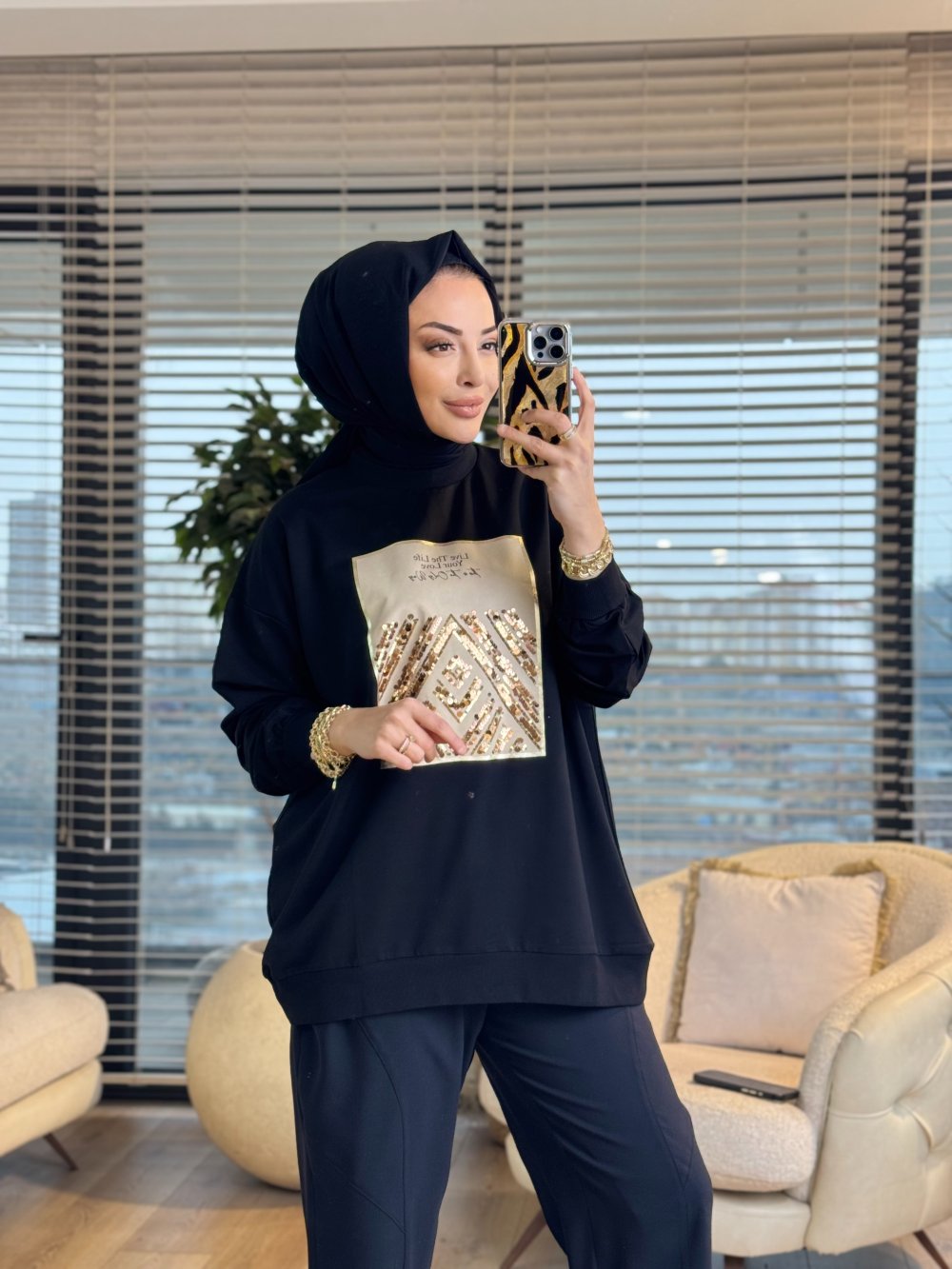 2695  Baskısı Pul Detaylı Sweatshırt Siyah