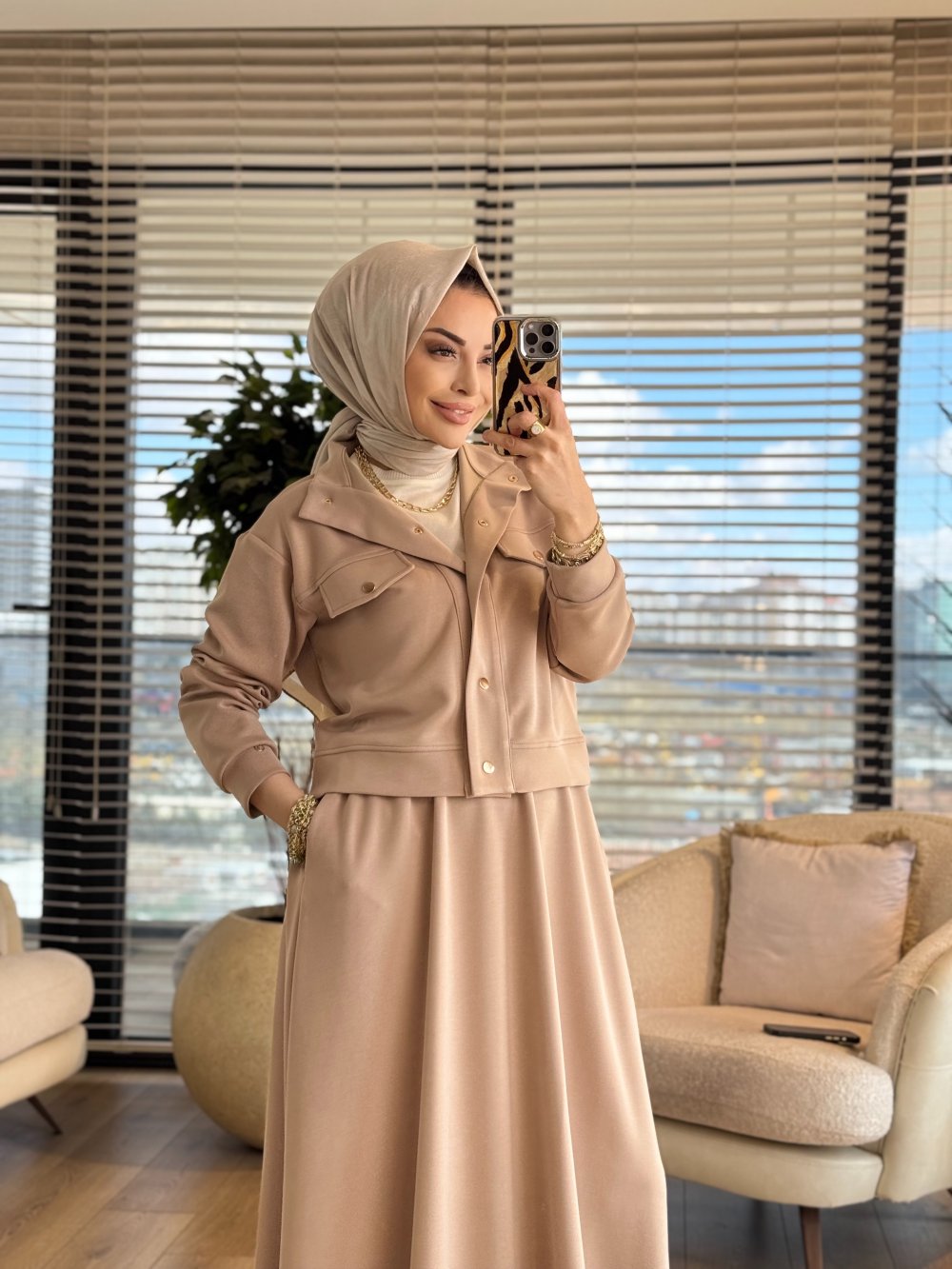 26YT604 Önü Gold Çıtçıtlı Etekli Takım Bej