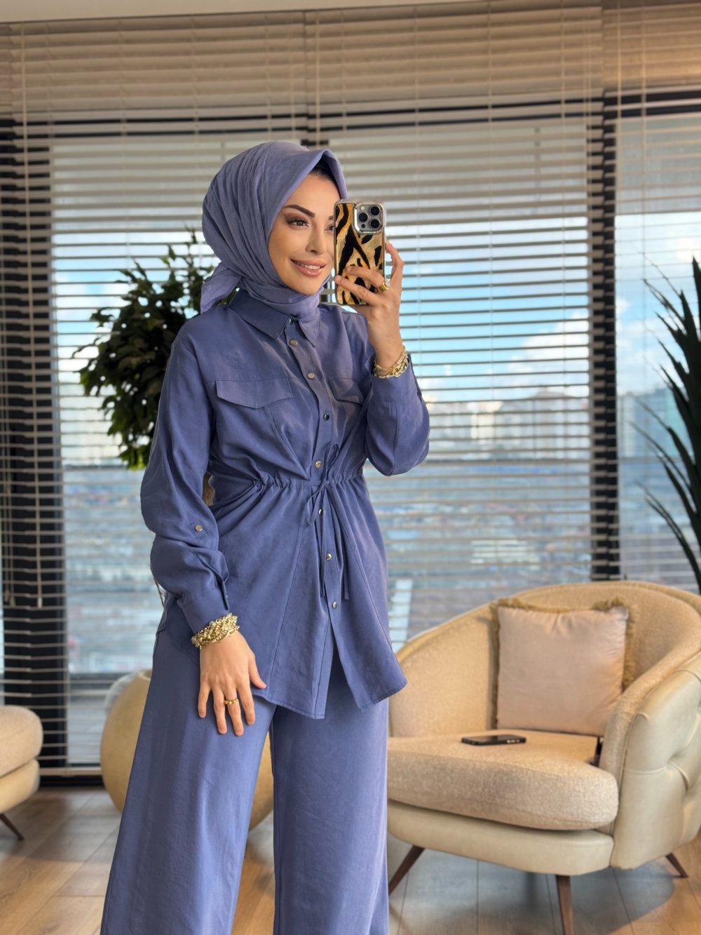 26YT619  Ön Cep Detaylı Beli Büzgülü Takım İndigo
