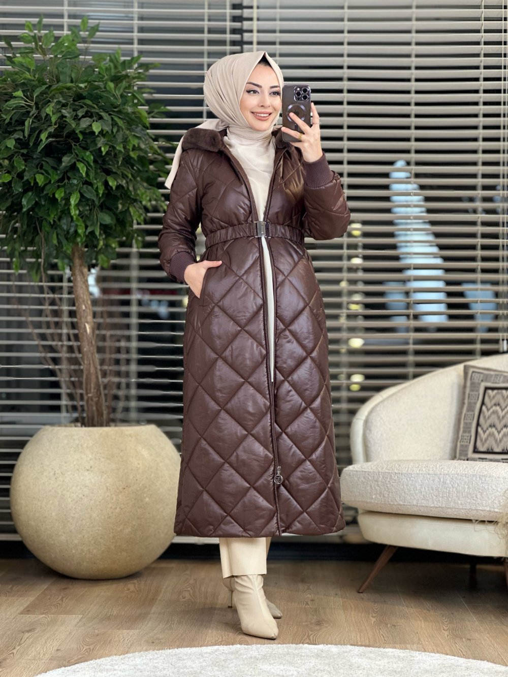 28-1035 Baklava desen Kapşonu Kürklü Şişme Kaban Kahverengi