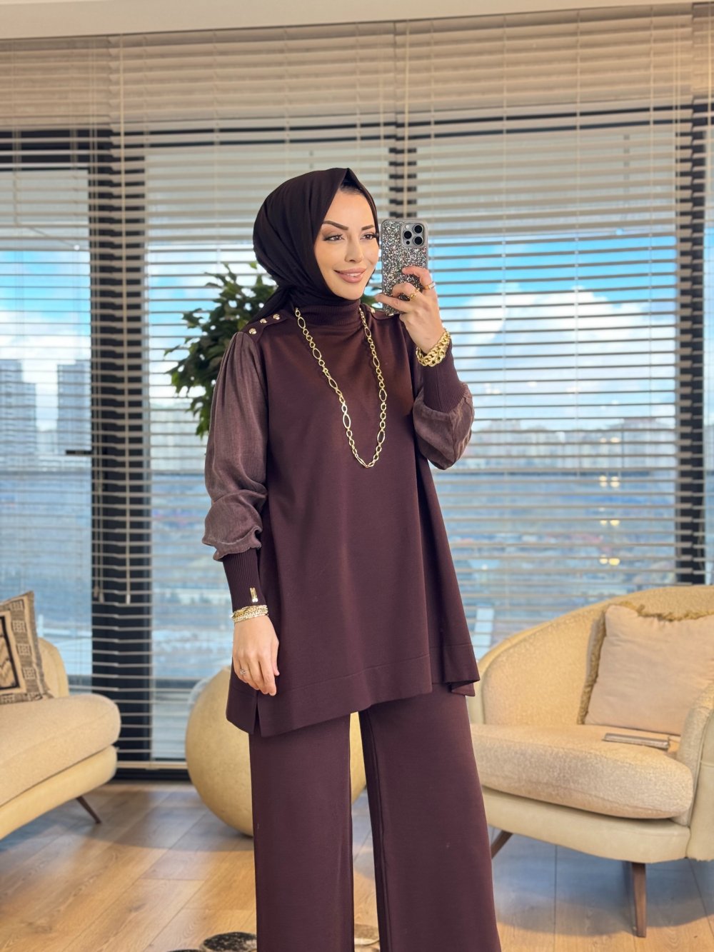 289 Omuzu Düğmeli Kupra Triko Tunik Kahve