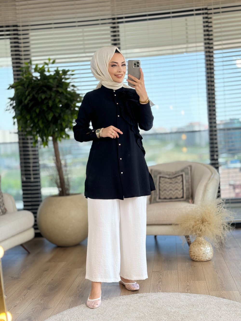 2972 Sağ Omuz Büyük Çiçekli Gömlek Siyah