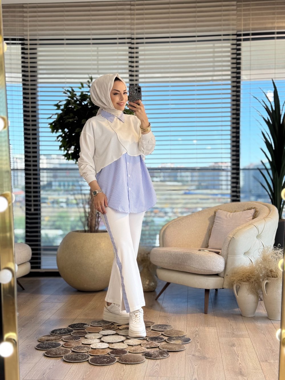 3064 Çizgi Garnili Pelerin Görünümlü Takım Ekru