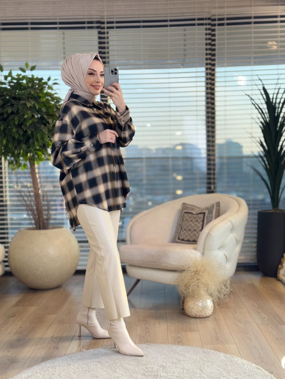 32097 Dikiş Detaylı Kareli Gömlek Latte