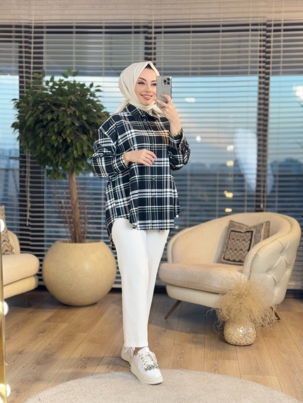 32097 Dikiş Detaylı Kareli Gömlek Siyah