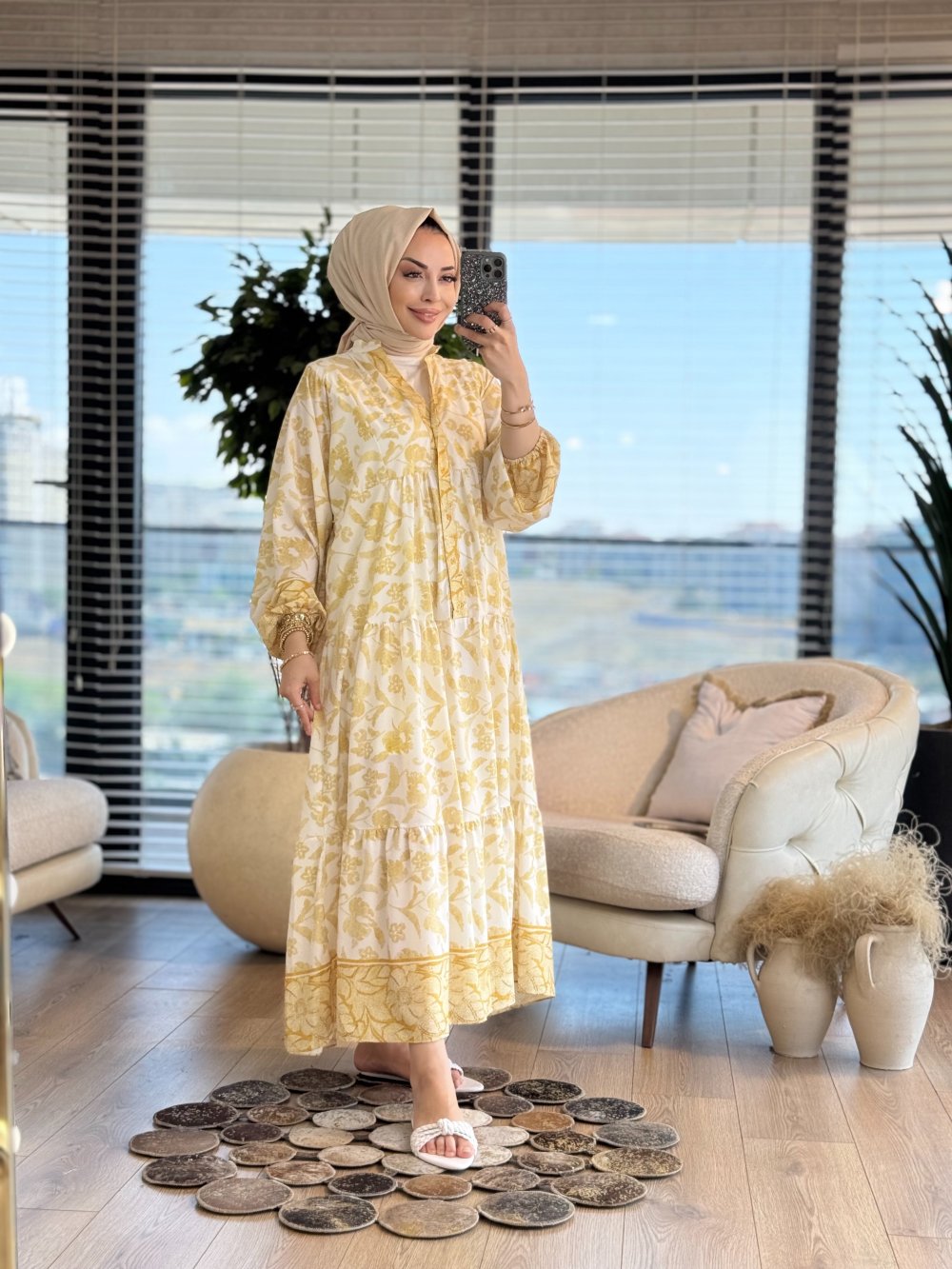 32361 Zikzak Çiçek Desen V Yaka Elbise Sarı