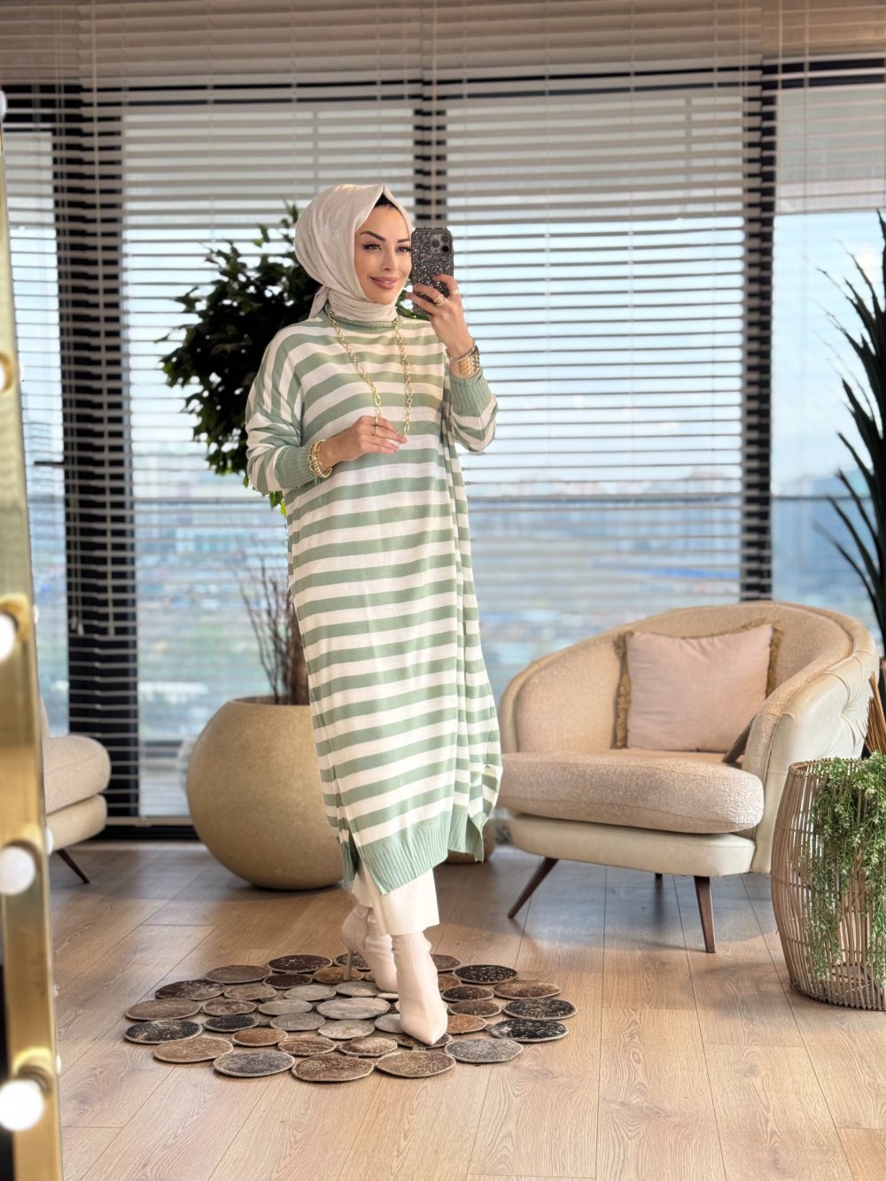 3389 Enine Kalın Çizgili Uzun Triko Tunik Çağla