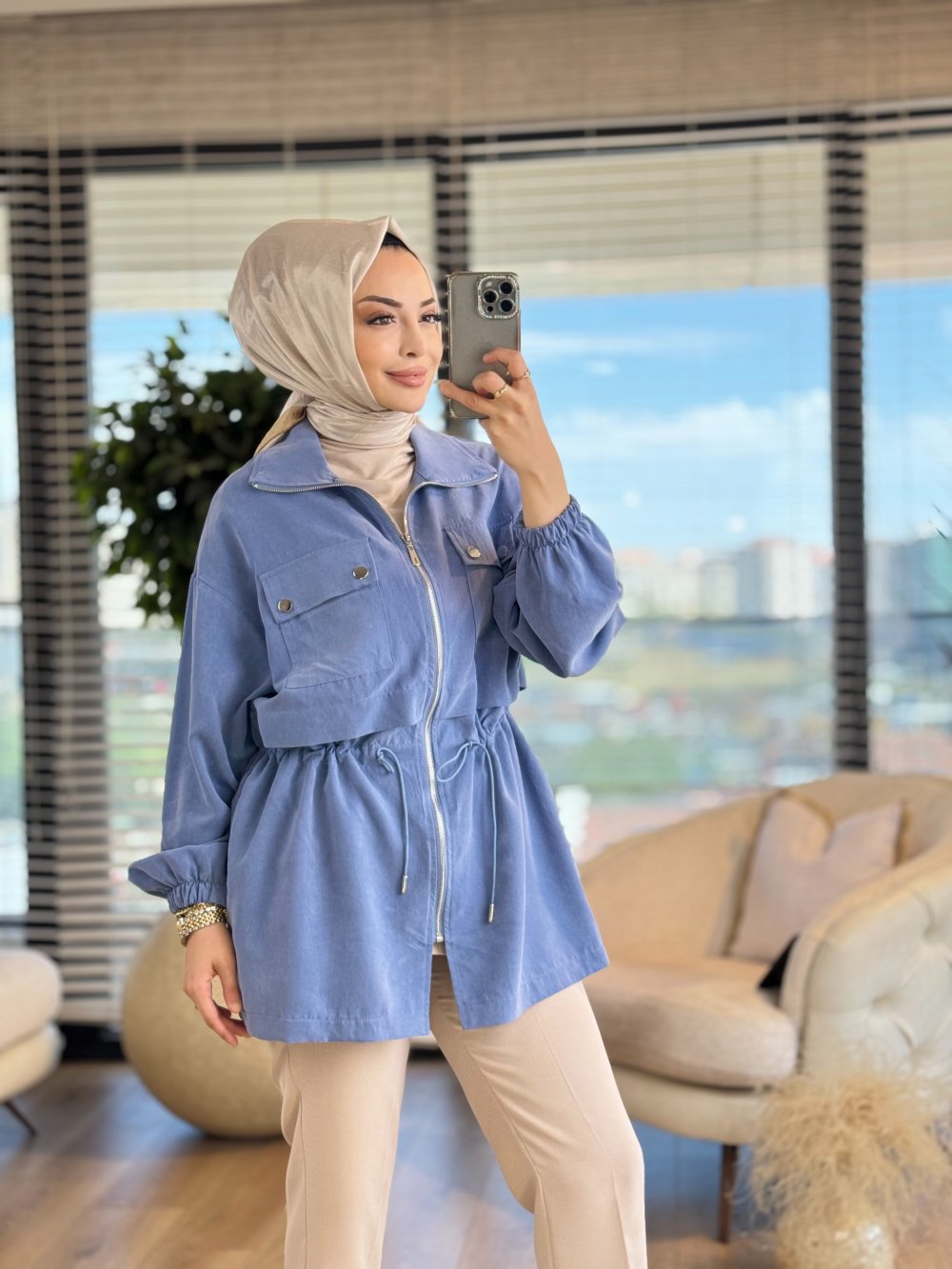 34082 Fermuarlı Dik Yaka Kap Mavi