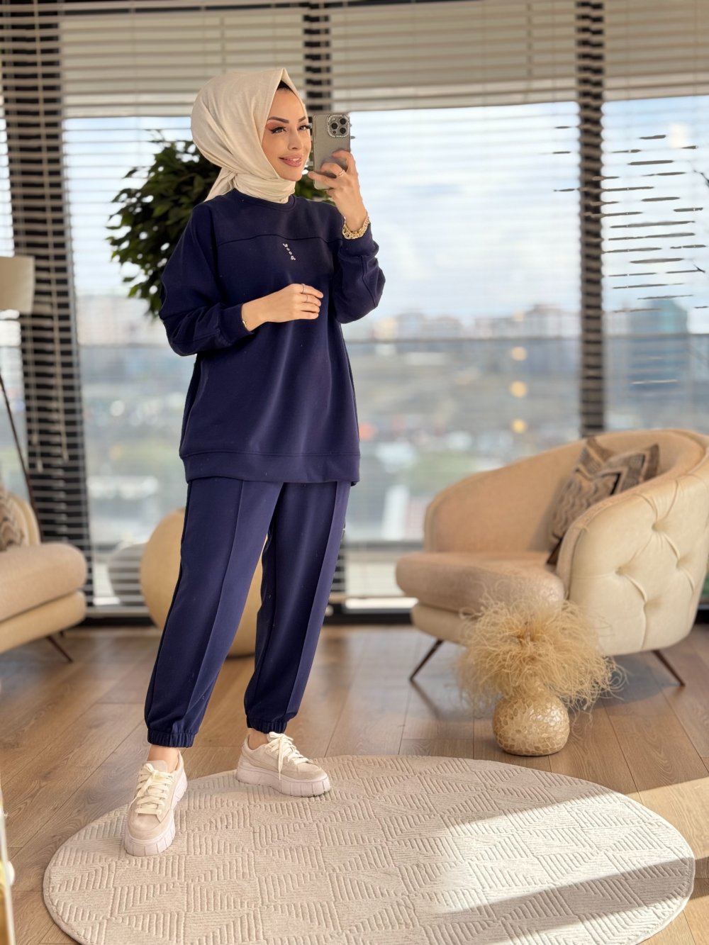 34382 Kesik Detaylı Ön Yazı Baskılı Takım Lacivert
