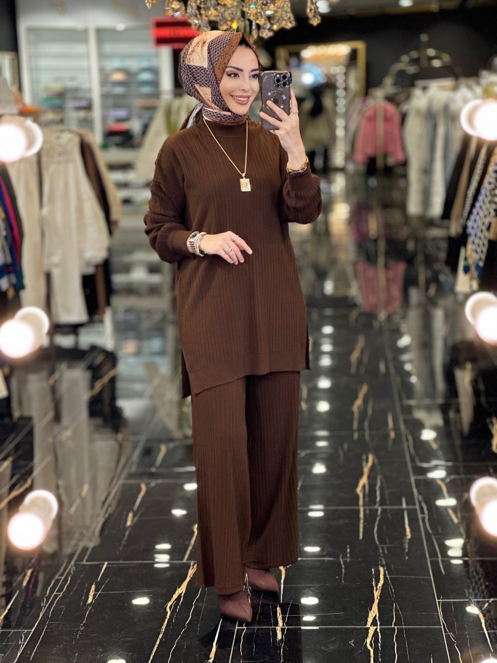 3444 Nopen Fitilli Triko Pantolon Takım Kahve