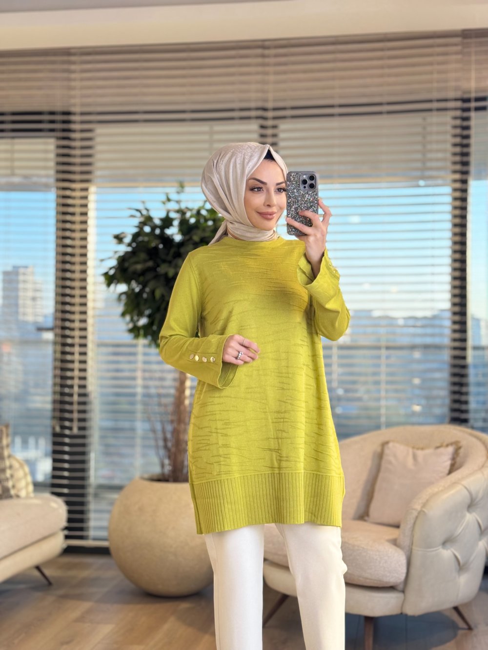 3503 Ön Kabartma Desenli Triko Tunik Yağ Yeşili