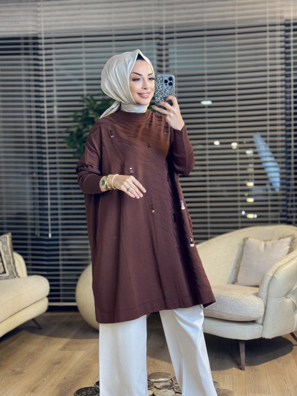 3508 Üst Pul Nakışlı Kendinden Desenli Triko Tunik Kahve
