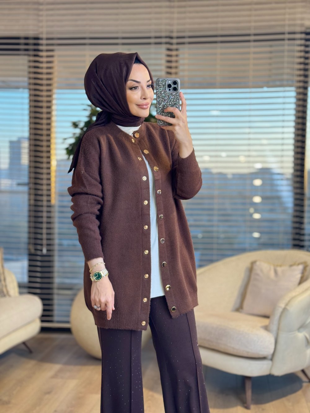 3539 Sakal Sıfır Yaka Çıtçıtlı Hırka Kahve