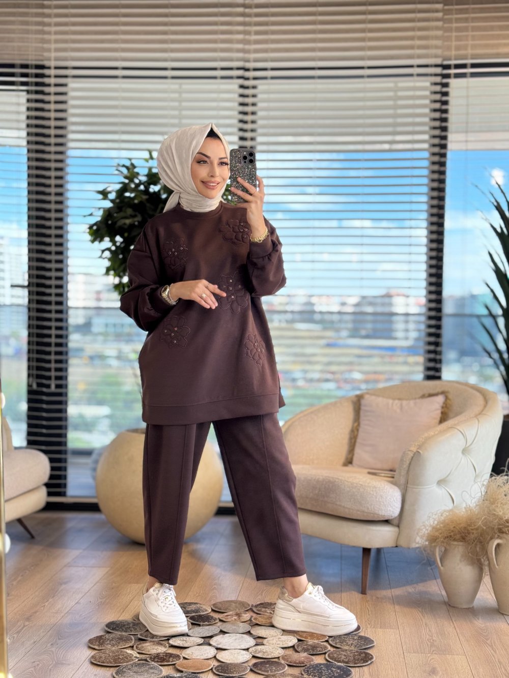 35442 Kabarık Çiçek Nakışlı Tunik Kahve