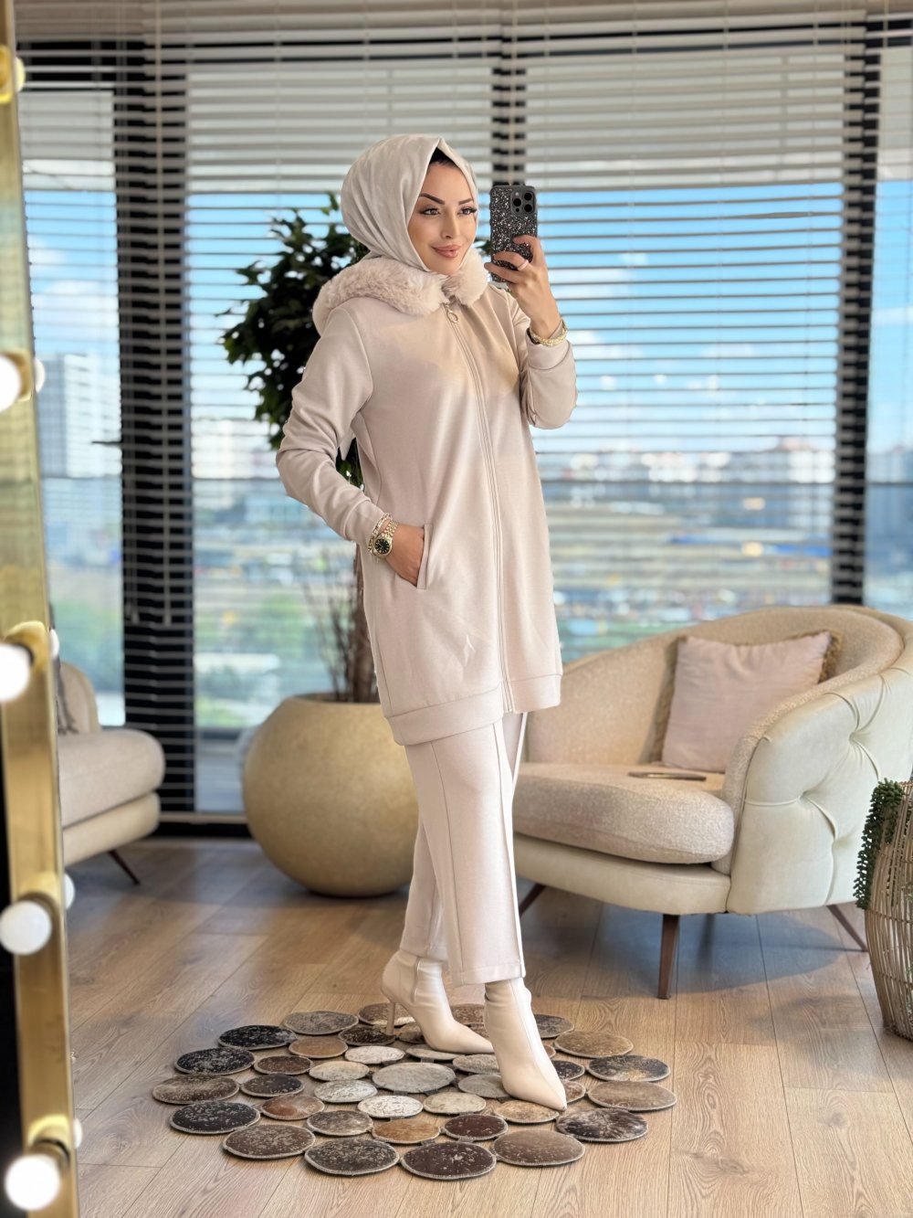 3950 Yaka Kürklü Fermuarlı Takım Bej