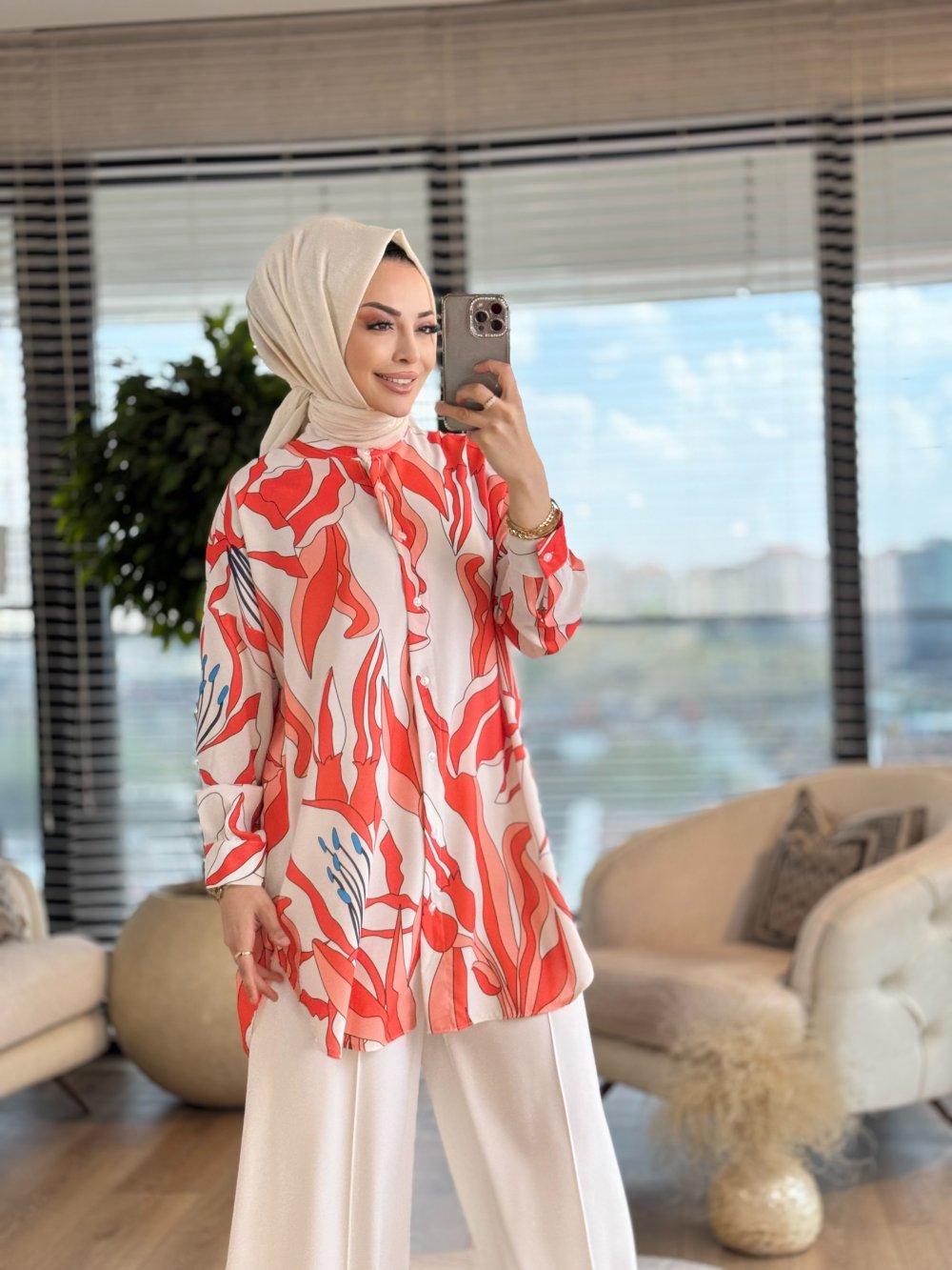 4016-9 Ege Büyük Çiçekli Tunik Ekru Kiremit