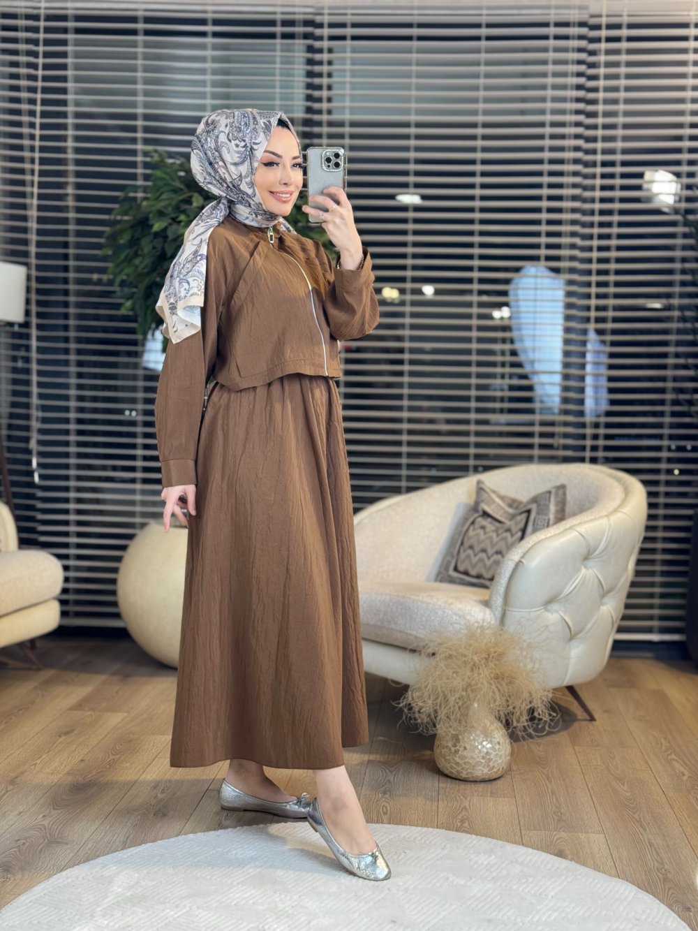 4069 Ön Parça Dikişli Etekli Takım Kahve
