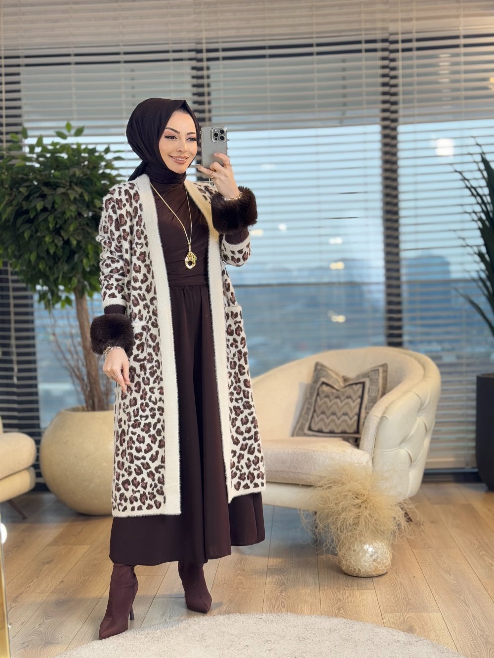 4143 Angora Leopar Desen Uzun Hırka Bej Kahve