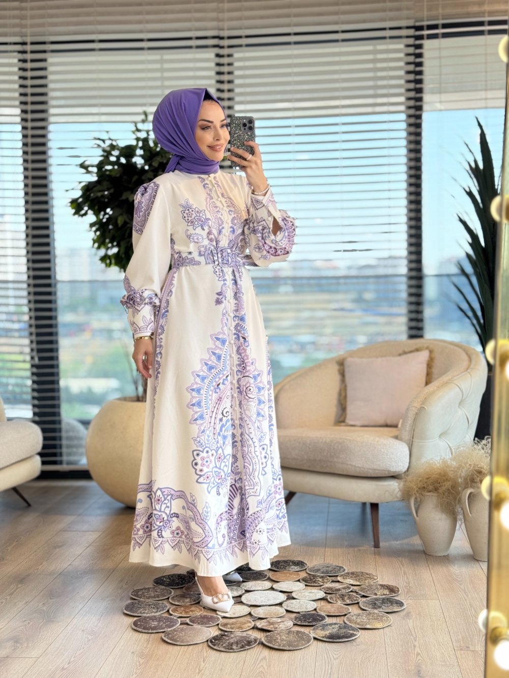 42122 Ön Arka Motif Desenli Elbise Ekru Lila